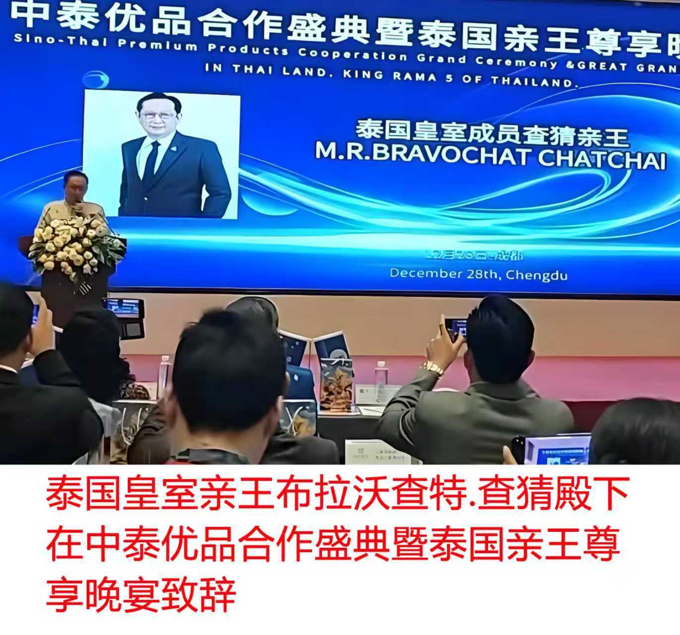 2025 年 12 月 28 日,泰国皇室亲王布拉沃查特·查猜殿下携王妃、泰国国际投资促进会主席贝恩博士、中非共和国治安法官YÉTINZAPA DANIEL.等重磅贵宾亲临中国四川成都,在天府新区的一处高端私密会所内,主持一场旨在缔结深厚友谊与深度认可的小范围高端专享活动——“中泰优品合作盛典暨泰国亲王尊享晚宴” 盛会。此次盛典由中泰双方联合举办。